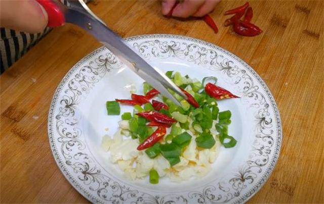 4.接下來再準備一些輔料,大蒜幾粒切蒜末,小蔥兩根切蔥花,切好一同放入碗中,喜歡吃酸辣味的還可以剪入幾粒紅辣椒。