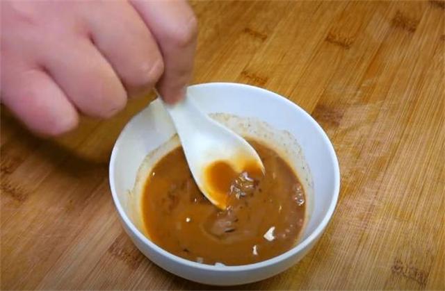5.最后我們來調一個料汁,碗中加入3克陳醋,加入3克生抽,加入3克素蠔油,加入1克胡椒粉,加入2克食鹽,再淋入少許水淀粉,用勺子把調料攪拌化開后備用。