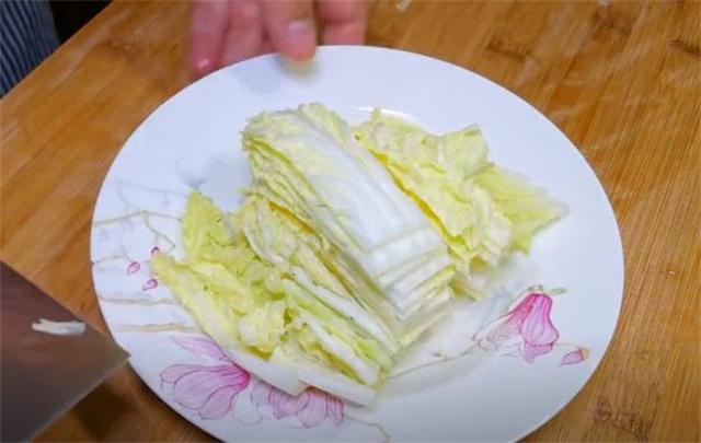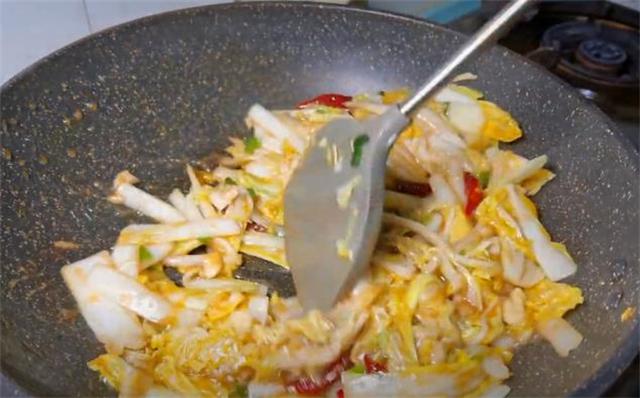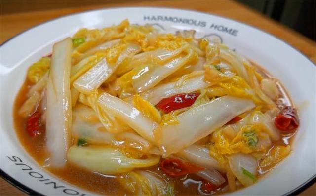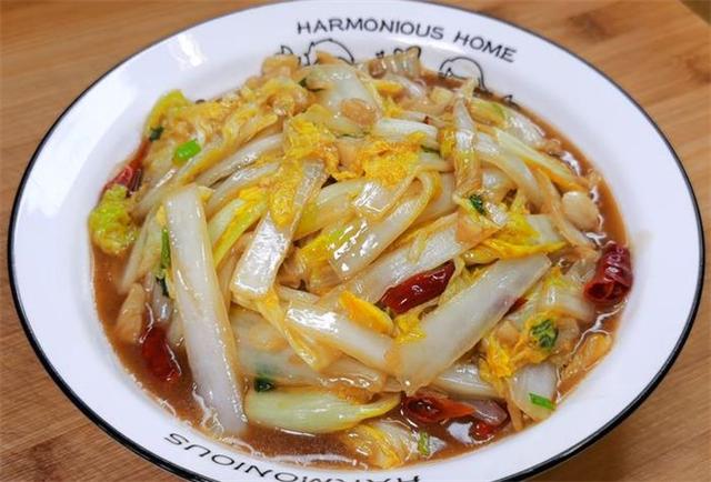 6.起鍋燒油,油熱以后下入準備好的輔料煸炒一會兒,炒出香味,炒香之后先下入白菜幫,白菜幫不易熟,煸炒1分鐘左右,把白菜幫炒至半熟。白菜幫炒軟后再下入白菜葉,再次翻炒1分鐘,把白菜葉炒至斷生,最后淋入準備好的調料汁,快速翻炒均勻后即可出鍋。
