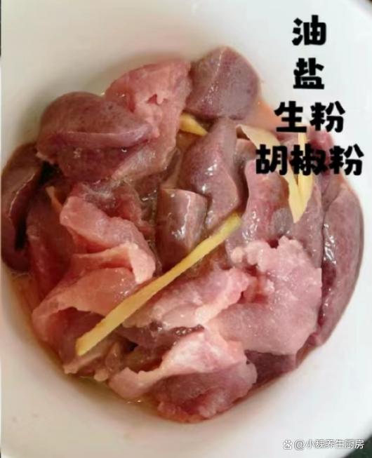 第三步:將豬肝片和瘦肉放在碗中,加上少許食鹽和胡椒粉,裹上少許生粉,滴入一些食用油,鎖住豬肝和肉片的水分,靜置20分鐘左右。
