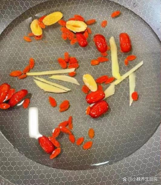 第四步:另外起鍋煮一些清水,放入黃芪,紅棗,姜片和枸杞子,加上足量純凈水,大火把湯汁煮沸。