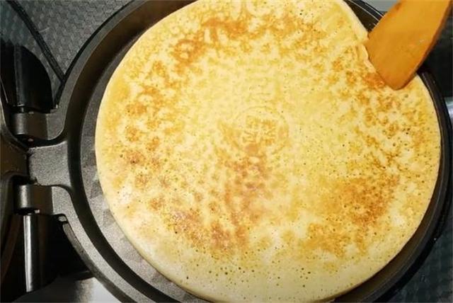 3.電餅鐺預熱1分鐘,兩面刷油,把面糊直接倒在電餅鐺里,蓋上蓋子燜上2分鐘左右,開始翻面,等兩面都金黃后,這個好吃的餅就做好了。
