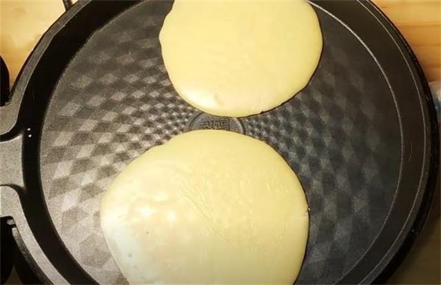 3.電餅鐺預熱1分鐘,用勺子舀一勺面糊,攤成小圓餅,等表面凝固后,翻面繼續煎1分鐘。