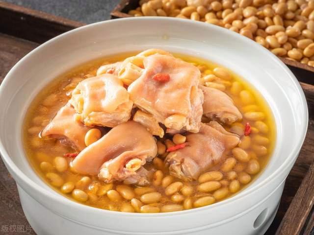 用料: 豬蹄500克,黃豆100克,生姜5片,大蔥2根,料酒適量,老抽適量,鹽適量,冰糖適量,清水適量。 做法: 1. 首先把黃豆用溫水浸泡,直到黃豆變軟。 2. 豬蹄洗凈,斬成塊,然后放入沸水中焯水。 3. 焯水的時候,加入一些生姜片和料酒,可以去掉豬蹄的腥味。 4. 焯好水的豬蹄撈出,用清水沖洗干凈。 5. 炒鍋加熱,加入冰糖,小火慢慢炒化。炒至冰糖變成紅色的糖色。 6. 加入豬蹄,大火翻炒均勻,讓豬蹄均勻的粘上糖色。 7. 加入姜片和大蔥段,翻炒均勻。