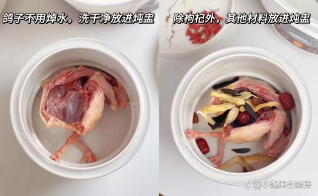 食材清單:選購干桂圓30克左右(干桂圓是新鮮桂圓經過曬干和加工而成,保留了原本的營養價值,干桂圓可以當成小零食,南方人喜歡拿來煲湯,具有養血安神,調理身體的作用),玉竹30克,紅參20克,枸杞子15克左右,幾個大紅棗,純凈水若干,少許冷水,一只新鮮鴿子(鴿子的營養價值高,俗話有一鴿勝九雞的說法,平常要常給家人喝鴿子湯),料酒少許,陳皮少許,老姜一大塊,食鹽若干,胡椒粉少許,其他佐料。 正確制作順序: