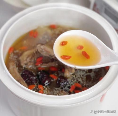 5:中途要撇去一層浮沫,繼續燉2個小時左右,等待鴿子肉燉至軟爛,調入少許食鹽調味,加上雞精和胡椒粉,最后放入洗凈的枸杞子,燜煮3到5分鐘左右。