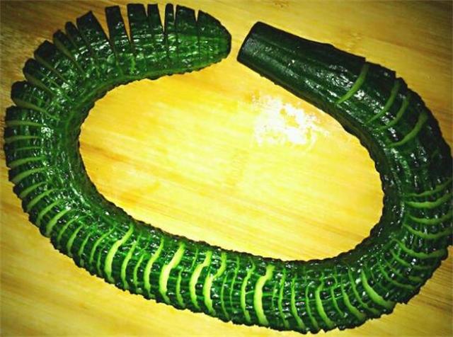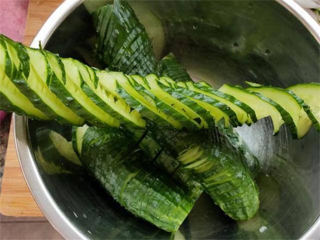 蓑衣黃瓜是一道非常適合夏天的涼菜,它的制作非常簡單,只需要幾個簡單的步驟就能完成。首先,我們需要準備新鮮洗凈的黃瓜,黃瓜底下放兩根筷子,刀刃與筷子呈45度角斜著下刀,切到筷子即可,切完一面后將黃瓜翻身用同樣的方法切完即可。然后,將黃瓜片用鹽腌制片刻,這樣可以去除黃瓜的澀味,使其更加清爽可口。接下來,將腌制好的黃瓜片擺放在盤子上,再撒上一些蓑衣黃瓜特有的調料,如花椒粉、香菜和蒜末。最后,輕輕拌勻,一道清爽可口的蓑衣黃瓜就完成啦!