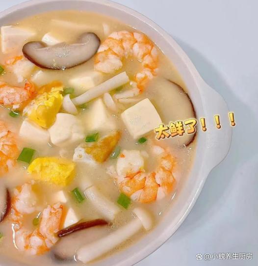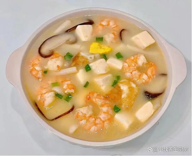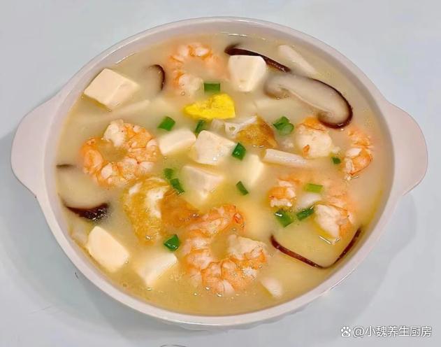 菌菇蝦仁荷包蛋豆腐湯是一款三伏天期間必喝的湯品,食材品種非常多,湯汁為奶白色,富含優(yōu)質(zhì)蛋白質(zhì),鈣質(zhì)和其他營養(yǎng),暖胃又健脾,補充鈣源,補足能量,迎接秋天。