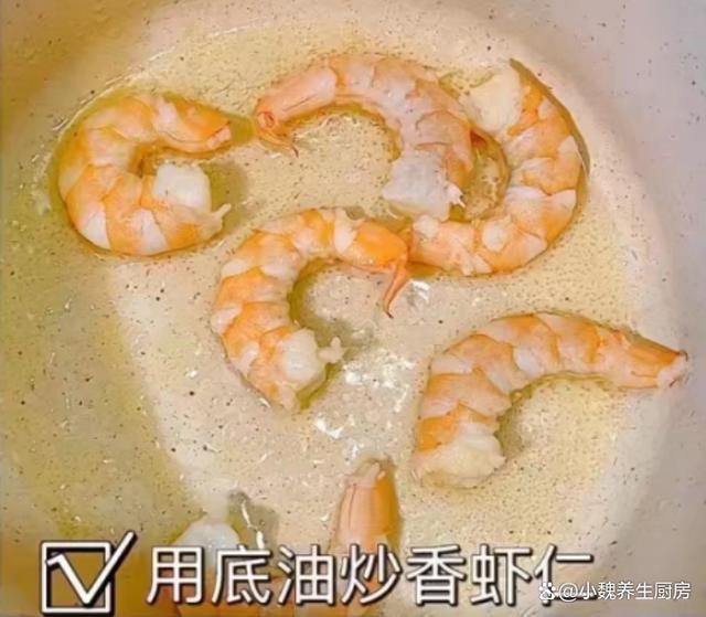 5:鍋底留少許油,加上一些豬油,放入腌制好的蝦仁,讓蝦仁煎至變色,倒入海鮮菇和香菇,用鍋鏟快速煸炒,將其炒至變軟。