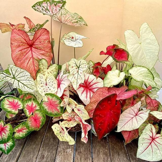 5、彩葉芋 彩葉芋屬于芋科,因其葉色鮮艷、形態優美而受到廣大人民群眾的喜愛。 整個植株色彩鮮艷,有些植株還帶有漸變效果,你可以根據自己的喜好選擇不同的顏色。 有了這顆‘彩葉芋’,別的芋頭就沒有什么味道了。像是蘋果香芋,孔雀香芋,雙口香芋之類的,顏色都要比彩葉香芋差一些。 這東西喜歡蔭涼,放在陰涼處也能生長,屬于高檔品種。 如果照料得當,同樣可以成為一株“巨無霸”,只是價錢稍微貴了點,但絕對物有所值。