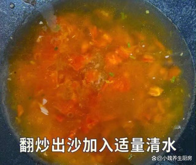 5:倒入一些西紅柿塊,讓西紅柿炒出沙,汁水都炒出來,加上700毫升清水,蓋上鍋蓋大火煮沸。