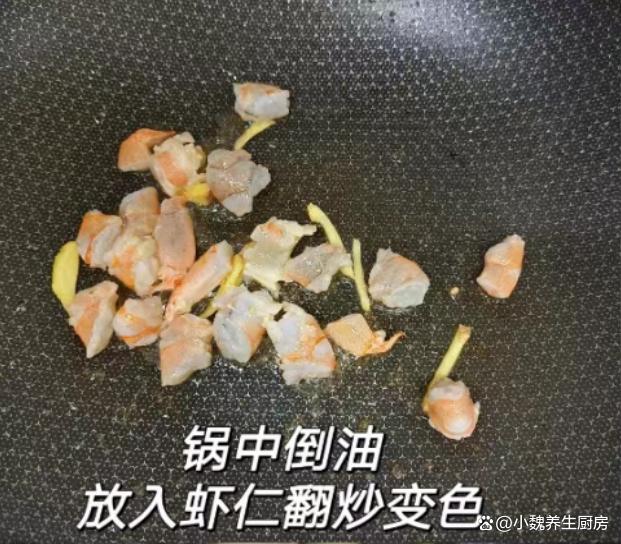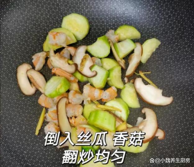 第四步:鍋底繼續(xù)加上植物油,放入一些蔥白和姜絲,放入一些蝦肉,用鍋鏟快速煸炒至變色。 第五步:加上一勺豬油,放入一些絲瓜和香菇,將兩種食材炒至變軟,加上足量清水煮沸,湯汁煮幾分鐘。