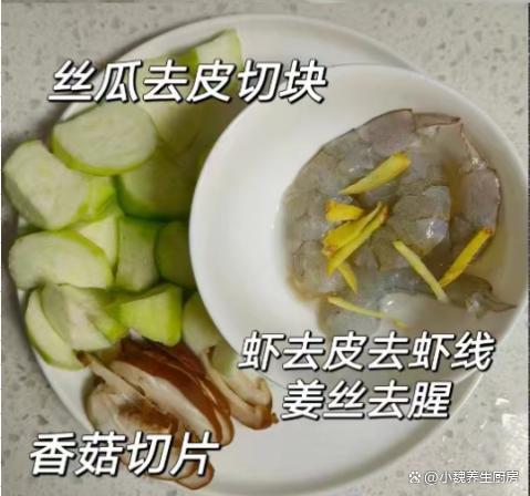 第一步:提前挑選好絲瓜,香菇,幾個雞蛋,鮮蝦和其他食材,先把大蝦的外殼剝掉,還要挑出里面的蝦線,蝦肉用姜絲和料酒腌制,去掉蝦肉的腥味。