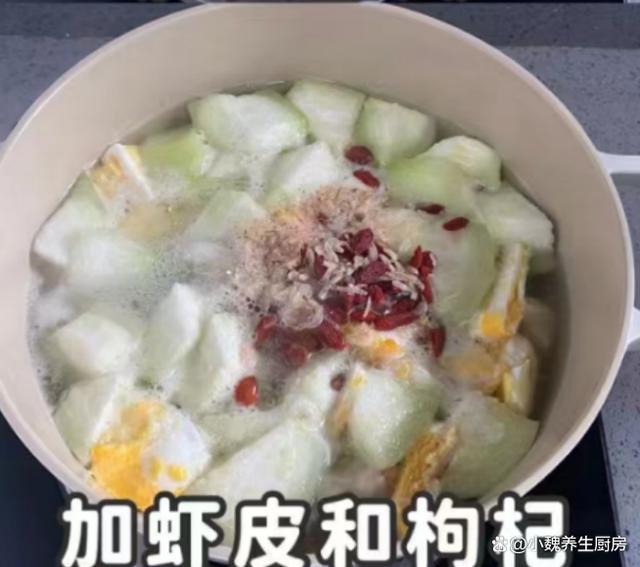 第四步:放入一些蝦皮燜煮一會兒,加上半勺雞精和少許食鹽,丟入一些枸杞子,撒上一些蔥花,燜煮2分鐘左右,出鍋,這款絲瓜荷包蛋絲瓜湯就制作完成了。