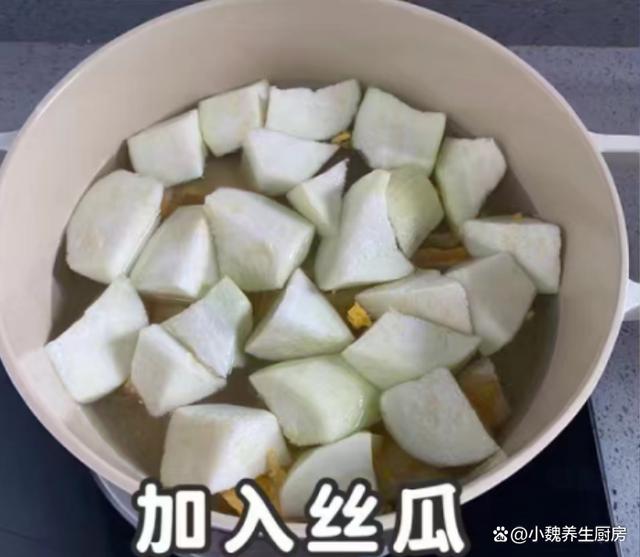 第二步:鍋中加上兩碗開水,將湯汁大火煮沸,絲瓜去掉外皮,洗凈切成若干滾刀塊,將絲瓜下鍋煮幾分鐘,讓絲瓜煮至變軟。
