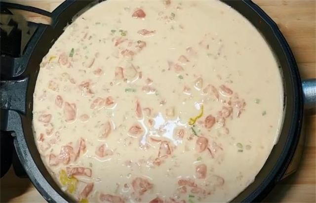 3.電餅鐺預熱刷油,把面糊直接倒在電餅鐺里,左右滾動使面糊平鋪均勻。