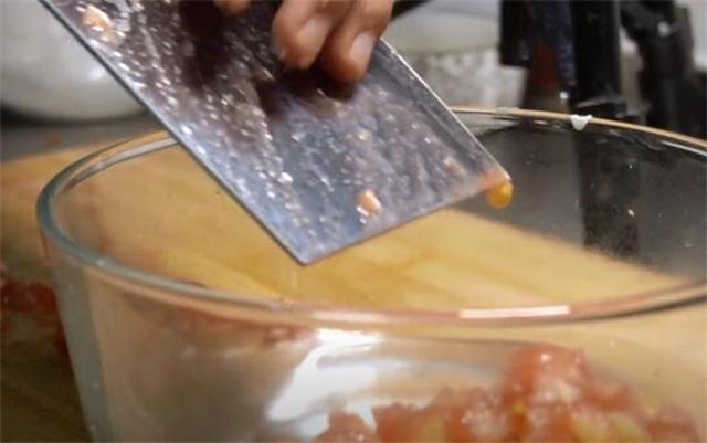 1.西紅柿切十字花刀,燙過的西紅柿好去皮,把西紅柿切塊,然后改刀切成末。