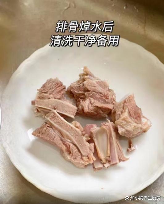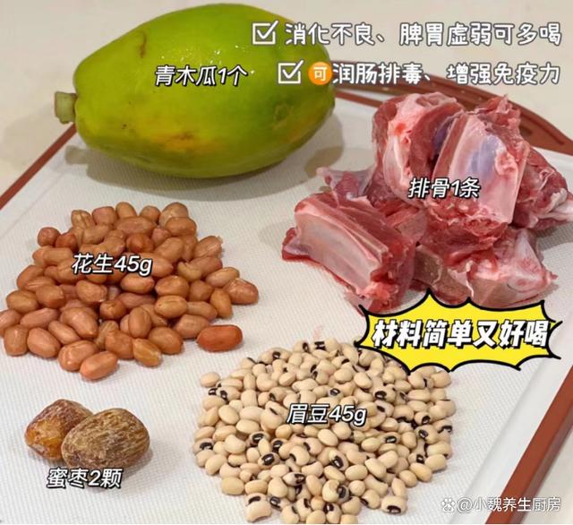 食材清單:選購青木瓜150克左右(木瓜是一種高維生素的水果,價格非常便宜,汁水非常豐富,既可以用來生吃,還適合用來煲湯),排骨400克新鮮豬骨(個人建議選擇肋排,特別是哈用來燉湯,但是需要提前焯水處理),花生米45克左右,霉豆腐45克,蜜棗兩個,少許溫水,純凈水和冷水少許,生姜一大塊,食鹽少許,香油幾滴,一丟丟胡椒粉,其他。