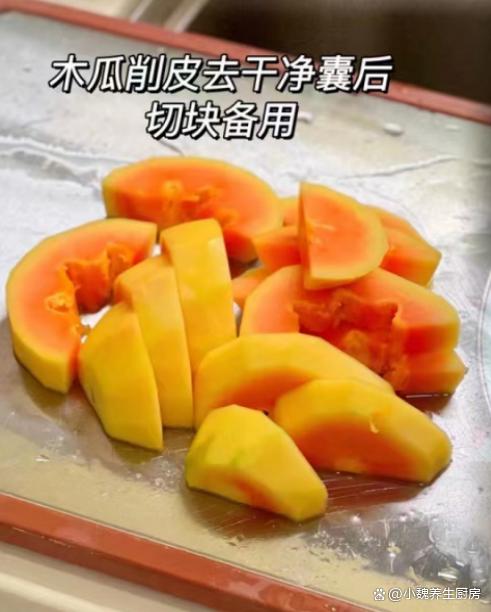 第二步:將青木瓜的外皮洗干凈,從中間對半切開,挖掉里面的瓜瓤,反復(fù)清洗干凈,切成若干小塊。