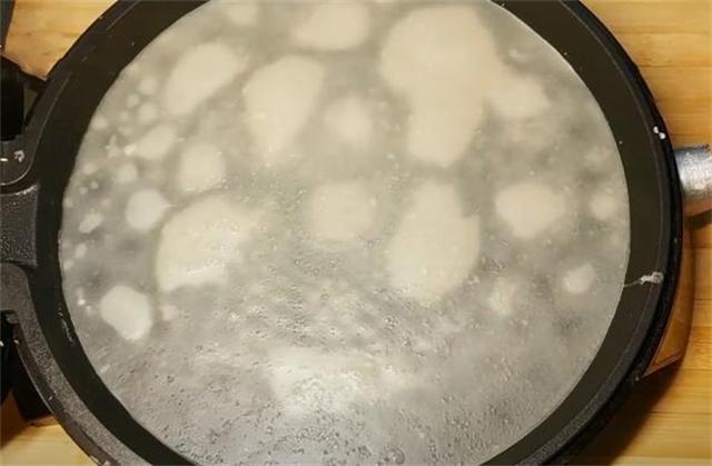 4.電餅鐺預熱底部刷油,倒入適量的面糊攤開,蓋上蓋子,燜上一兩分鐘,表面起泡的話就代表涼皮熟了。