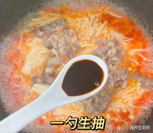 5:加上適量冷水煮開,放入一些金針菇燜煮一會兒,放入焯水好的肥牛卷,加上一勺生抽和一小勺蠔油,繼續(xù)煮3分鐘左右。