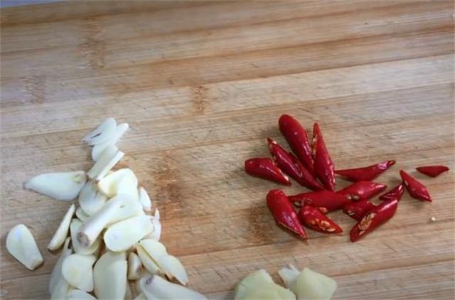 2.接下來準備一些大蒜,給它切成蒜片,再準備一塊生姜切成姜片,幾個小米辣斜刀切成段,全部切好之后先放一旁備用。