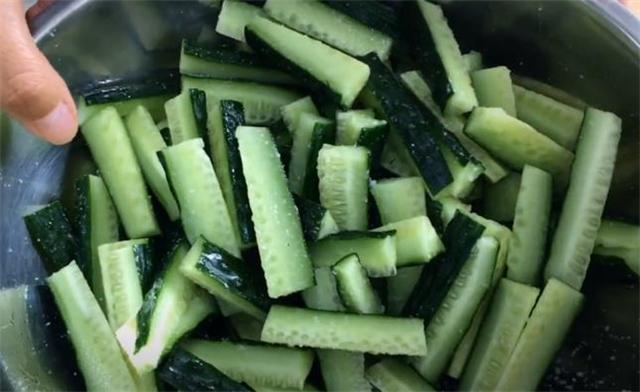 4.全部切好之后裝入盤中,再加入適量的食鹽,把黃瓜條腌一下,殺出里面的水分,拌勻以后放到旁邊腌制兩個小時以上。