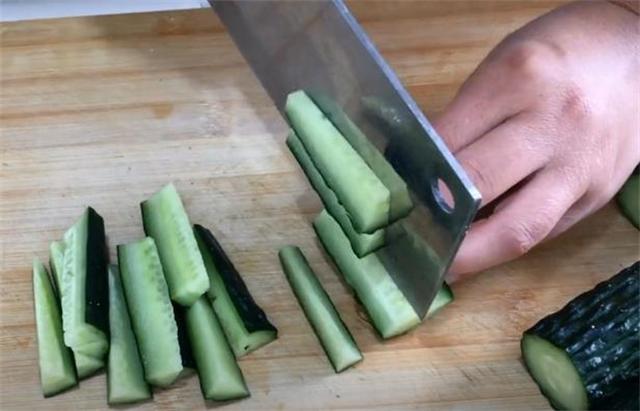 3.晾干水分的黃瓜先切去頭尾,再切成五公分寬的小段,切好之后再將每一個小段給它切成小條。