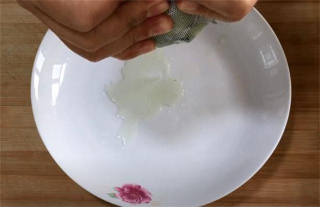 6.這時候黃瓜也腌出來好多水分,我們給它放到一塊紗布中,擠干里面的水分。