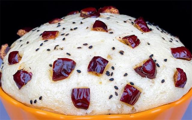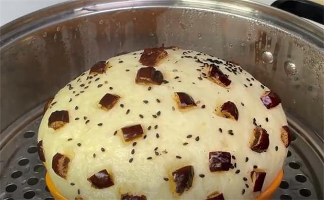 5.二次發酵好的面糊,明顯比原來變大了許多,接著再撒一層黑芝麻點綴一下,再擺上紅棗丁,這樣好看又好吃,蓋上蓋子,水開上汽后蒸30分鐘,時間到后先關火,再燜5分鐘出鍋,讓熱氣散一散,防止發糕遇到冷空氣塌陷回縮。