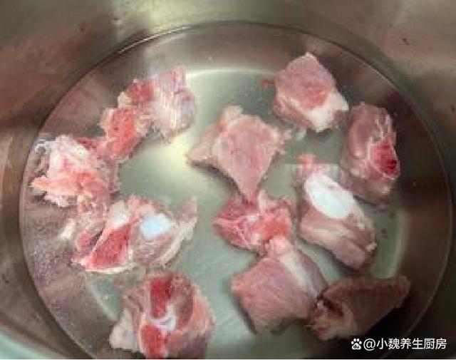 步驟3:提前把龍骨剁成塊,龍骨用冷水泡一泡,大蔥切成若干小段,生姜切成一些片狀,準備好一些食材,開始制作這款黑豆苦瓜龍骨湯吧。 步驟4:另外準備好湯鍋,鍋里放入龍骨和冷水,加上少許料酒和黃酒,放入若干片生姜,大火燉煮幾分鐘,去掉龍骨的血腥味,溫水沖洗掉一些浮沫。