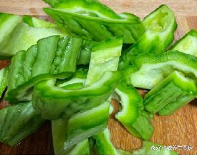 步驟2:將苦瓜表面洗干凈,從中間對半切開,去掉苦瓜的頭尾,挖掉苦瓜的內瓤,徹底清洗干凈,切成長度相同的塊,苦瓜可以用鹽水泡一會兒,控干表面的水分。