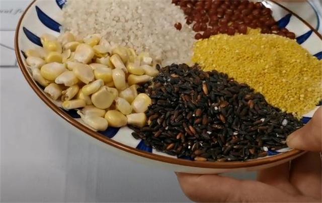 準(zhǔn)備食材: 紅豆、大米、玉米粒、黑米、小米、清水、食用油 具體做法: