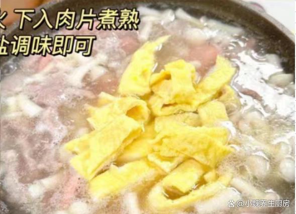 7:加上適量開水煮沸,然后下入一些豬肉片,等待豬肉煮至變色,最后放入雞蛋絲,調入少許味極鮮,雞精,胡椒粉和食鹽來調味,燜煮2到3分鐘左右。