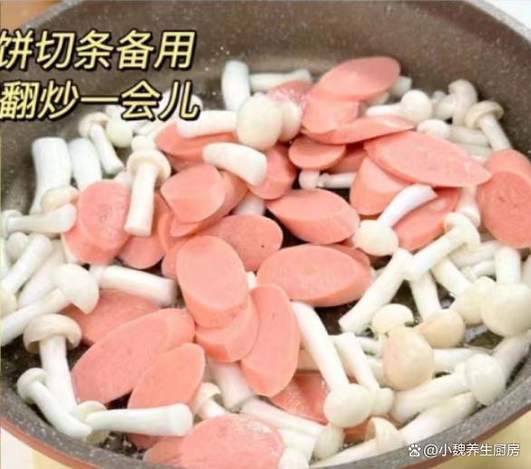 6:鍋中加上一丟丟植物油和豬油,讓豬油都融化開,放入蔥姜蒜快速爆香,倒入海鮮菇和火腿腸片,迅速煸炒一會兒。