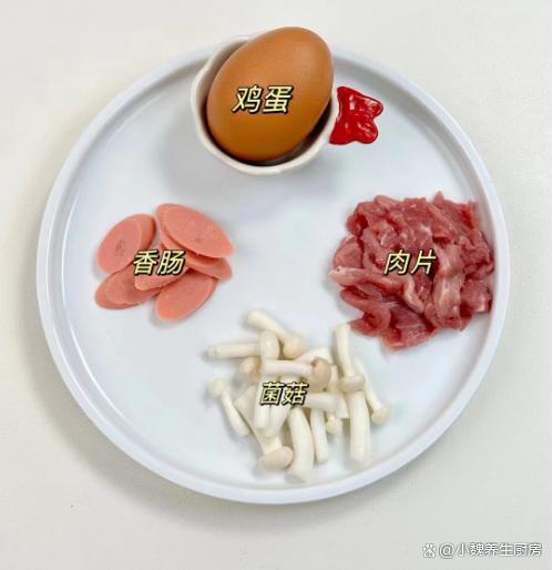 食材清單:選購300克新鮮豬肉里脊(或者用牛肉里脊替代,豬肉要選擇新鮮的,肉質想要非常鮮嫩,一定需要提前腌制調味),優質火腿腸一根,雞蛋2個,適量橄欖油,少許豬油,香蔥若干根,少許食鹽,清水足量,開水2大碗,海鮮菇100克左右,生姜,適量玉米淀粉,半勺料酒,醬油半勺,味極鮮半勺,食鹽和胡椒粉少許,其他佐料。