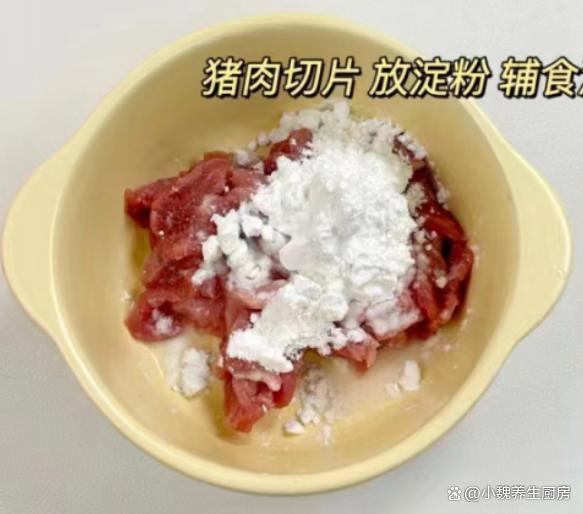 4:先把豬肉里脊反復洗凈,改刀切成若干片,里脊肉放在容器中,肉片用料酒和降壓藥腌制,裹上淀粉,加上少許清水,加上少許食鹽抓拌均勻,準備好腌制好的肉片和其他食材,開始制作這道海鮮菇火腿腸雞蛋滑肉湯吧。