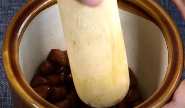 5.花生米放涼之后倒入搗蒜器里面,然后把花生米搗碎。