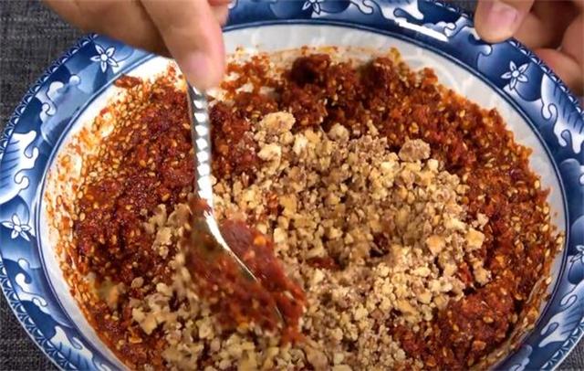 6.搗碎之后加入到辣椒碗里,用勺子充分攪拌均勻備用。
