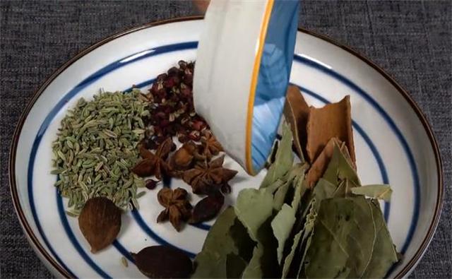 1.我們先做一個料油,準備一個盤子,放入3g花椒,5g小茴香,3g八角,3g草果,6g桂皮和3g香葉。