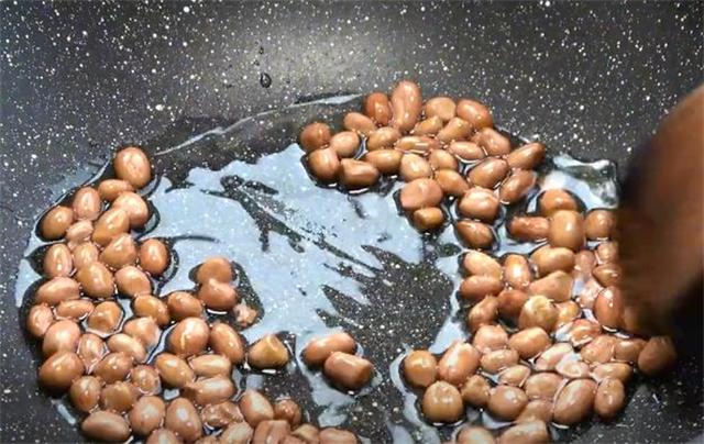 3.鍋里面加入食用油,油熱之后放入適量的花生米,開小火慢炒,炒熟盛出備用。