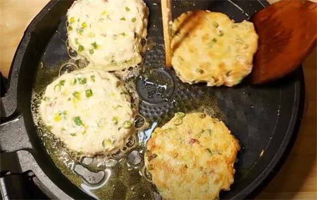 4.電餅鐺預熱多放油,手心涂抹少許油,取適量餡料團成一個團子,直接放在電餅鐺里按扁,等烙至一面定型后,翻面繼續煎,等煎至兩面金黃后即可出鍋。