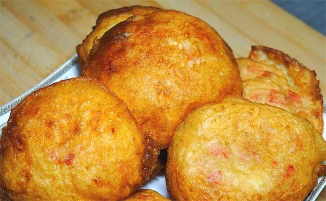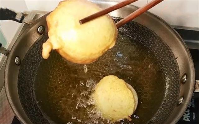 6.用勺子舀一勺面糊,直接放入鍋內炸,等底面定型后即可脫離,煎炸至飄起兩面金黃即可。