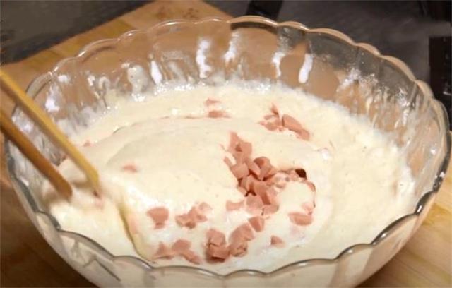 4.時間到,面餳好了,把素火腿丁放到面糊內,順時針攪拌均勻。