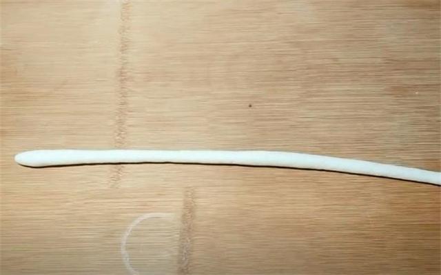 4.準備一半的素火腿腸,用面把素火腿腸包圍起來,上下兩端捏緊,這樣一個毛毛蟲的生胚就做好了。