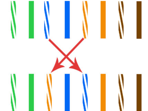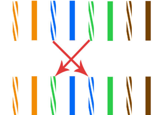 568B標準:橙藍綠棕,三五互換 將網線從左至右排序為白橙、橙、白藍、藍、白綠、綠、白棕、棕,然后將第三根和第五根線互換(互換后變成白橙、橙、白綠、藍、白藍、綠、白棕、棕),捏平,剪齊。將水晶頭觸片朝上,線口朝右,左手拿頭,右手送線,網線頂頭后,送人網線鉗壓線,力度適中、壓線到位。