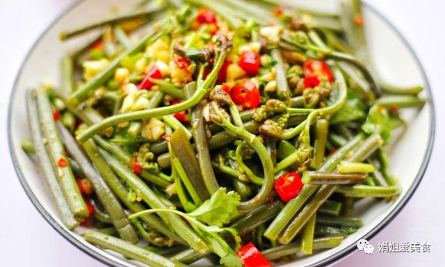 蕨菜的處理方法 1. 清洗:將蕨菜放入清水中浸泡,用手輕輕搓洗,去除泥沙和雜質。 2. 去皮:將蕨菜的根部和老莖部分去皮,去除硬殼和纖維。 3. 切段:將蕨菜切成適當的長度,一般為3-5厘米。 4. 焯水:將蕨菜放入沸水中焯水,時間不宜過長,一般為1-2分鐘。 5. 冷水浸泡:將焯好的蕨菜放入冷水中浸泡,去除余溫,使其更加爽脆。 6. 瀝水:將浸泡好的蕨菜撈出,瀝干水分,備用。 7. 烹飪:蕨菜可以炒、煮、燉、蒸等多種方式烹飪,根據個人口味選擇不同的烹飪方法。 涼拌蕨菜