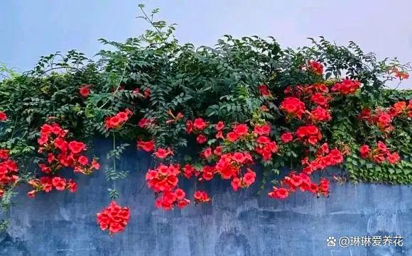 凌霄花有一個稱號叫做爬墻大王,10平方的墻壁,兩年就可以爬滿,到了第3年,基本上就可以開出整面花墻,花期可以一直開放到秋天,到了深冬季節,伴隨著溫度的下降,花期會結束,葉子也會枯黃,但是它的枝條會一直附著在墻壁上。