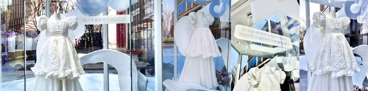 現場展出的紙巾婚紗,整體均使用維達紙巾制作,并以婚紗為中心向后方延展出拖尾樣式的地貼,地貼上寫滿了贈予女性的鼓勵宣言。材質柔軟、有韌性的紙巾婚紗不僅將品牌特性與節日蘊意深層次聯結,而且契合“維達紙巾婚紗韌性初舞臺”的傳播主題,鼓勵女性無論什么年齡,都要韌性成長,深度傳達女性力量。