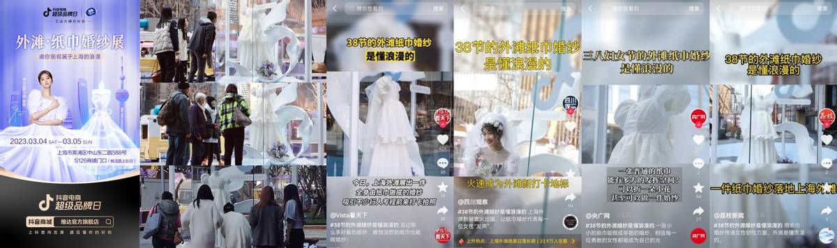 紙巾婚紗展落地上海外灘,線上線下聯動助推活動聲量爆發 圍繞維達品牌產品紙巾韌性強這一賣點,借三八國際婦女節的節日節點,維達抖音電商超級品牌日將紙巾與婚紗結合,表達紙巾具有一定韌性可以做成婚紗,那么女生也一樣,只要你勇敢、堅韌,有屬于自己的韌性,就可以成為自己想要的樣子。 3月4日-3月5日,維達聯合抖音電商超級品牌日在上海外灘舉辦線下紙巾婚紗展,這場別開生面的紙巾婚紗show,吸引眾多行人和達人前來打卡,引發多家新聞媒體進行報道,為活動充分預熱。